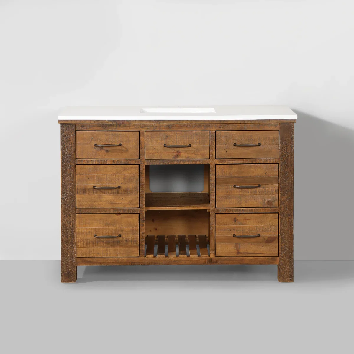 Bring farmhouse charm into your bathroom with this freestanding single vanity set. It has a solid wood base with a vintage pine finish, and it rests on four clean-lined straight legs for a crisp look. Seven drawers (one of them a drop-down accessory drawer) along with two center slatted shelves give you lots of room for towels, toiletries, and smaller bathroom essentials. A white quartz countertop measures 48" wide, and it includes a rectangular ceramic undermount sink. Take note: A compatible faucet is sold separately.