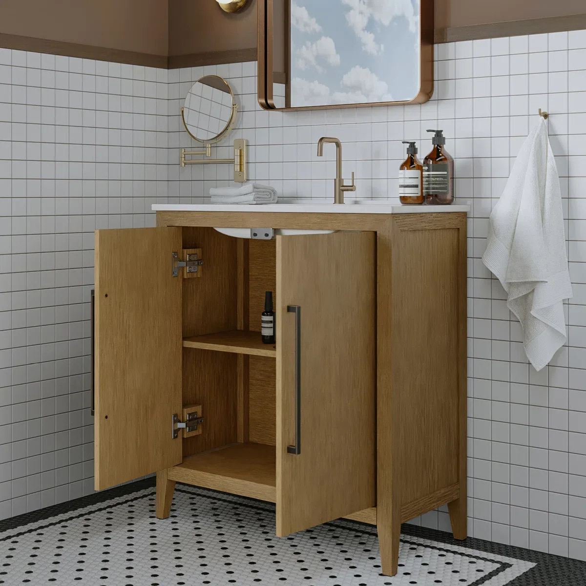 Elevate your bathroom or powder room with the Bergen single small space bathroom vanity, a timeless classic that seamlessly blends into any décor from traditional to modern. This premium 30" wide × 14" deep freestanding vanity features solid wood construction with a multi-step finish, standing on elegant tapered legs for sophisticated appeal. Generous storage includes two cabinet doors with an adjustable shelf, providing ample space for all your bathroom essentials.