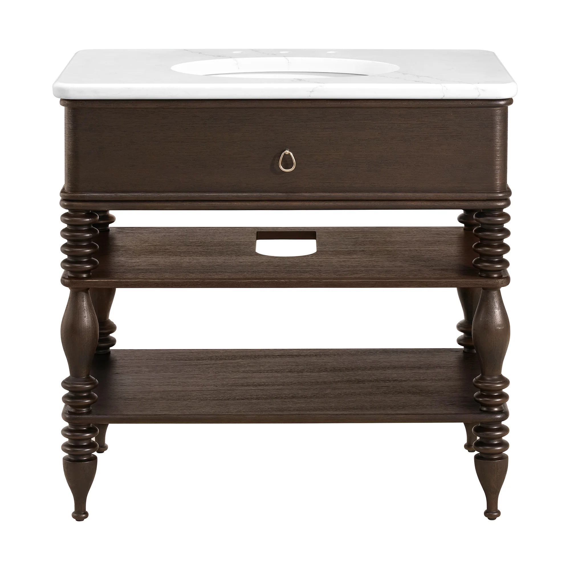 Open shelving offers space to store or display towels, baskets, and bath essentials, while the Carrara quartz top provides a durable, polished contrast. Champagne-toned hardware adds a soft metallic accent that complements both traditional and contemporary interiors. Easy to assemble and thoughtfully scaled for smaller bathrooms or powder rooms, Chantilly blends timeless design with everyday function.