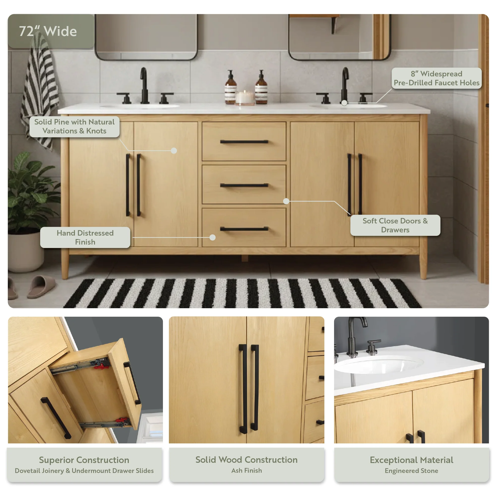 Mid-century meets modern. Elevate your bathroom with our 72" double vanity, featuring a solid wood frame and a sleek pure white quartz top. Ample storage space awaits behind soft-closing doors and drawers, while adjustable shelves let you customize to your heart's content. The undermount ceramic sink adds a touch of sophistication, and the hand-distressed finish gives it that extra flair. Just add your favorite 8" widespread faucet to complete the look.
