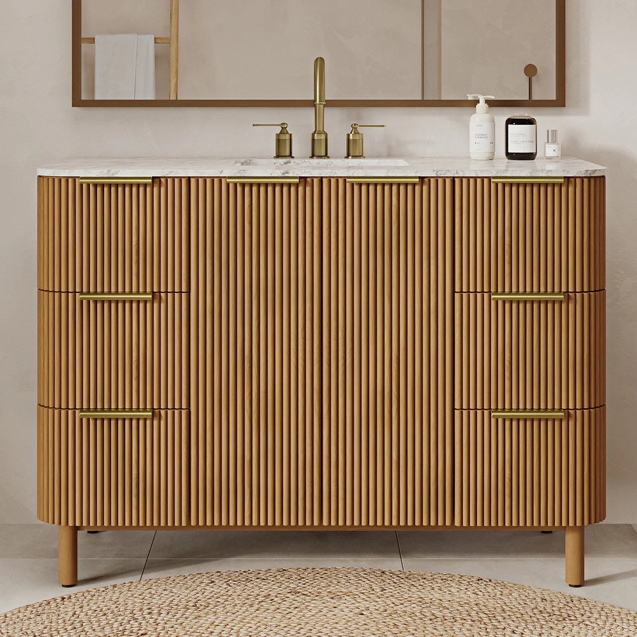 Introduce a sense of natural radiance to your primary suite with the Havana 48" Vanity, a luxury centerpiece designed to brighten and elevate your bathroom aesthetic . This freestanding unit is masterfully constructed with a solid reeded birch frame in a warm Golden Honey finish, offering a textured, furniture-grade quality that lasts. The vanity features a premium Carrara marble countertop paired with a pre-installed undermount ceramic sink for a classic and durable surface. To ensure a tranquil environment, the expansive cabinetry is equipped with soft-close drawers and doors that provide ample, silent storage for all your wellness essentials. Experience the perfect blend of artisanal craftsmanship and timeless stone with this expertly finished statement piece.