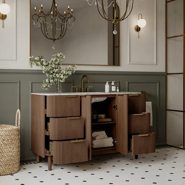 Transform your primary suite into a high-end retreat with the Havana 54" Vanity, a grand centerpiece that masterfully balances traditional warmth with modern texture. This expansive freestanding unit is built with a solid reeded birch frame in a rich brown finish, ensuring furniture-grade durability and a sophisticated, tactile aesthetic. The vanity is crowned with a premium 1-inch thick Carrara marble countertop and a pre-installed white ceramic undermount sink for a seamless, upscale look. Optimized for maximum organization, the design includes spacious soft-close drawers and doors that provide silent, high-capacity storage for all your daily essentials. Elevate your home renovation with this expertly finished piece that proves large-scale design can be both functional and breathtaking.