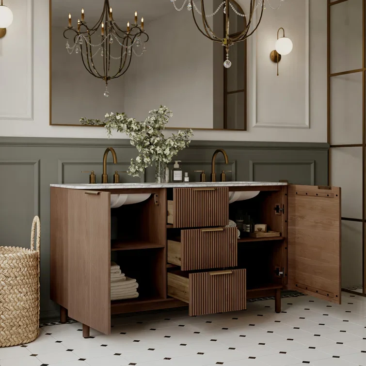 Elevate your shared primary suite with the Havana 60" Double Vanity, a grand centerpiece that masterfully combines traditional warmth with modern textured design. This expansive freestanding unit is expertly built from solid reeded birch in a rich brown finish, offering furniture-grade durability and a high-end tactile aesthetic. The vanity is crowned with a premium Carrara marble countertop and features dual undermount ceramic sinks, providing a sophisticated and symmetrical workspace for two. To ensure a peaceful morning routine, the cabinetry is equipped with spacious soft-close drawers and doors for silent, high-capacity storage. Transform your bathroom into a luxury retreat with this perfectly balanced blend of classic craftsmanship and contemporary scale.