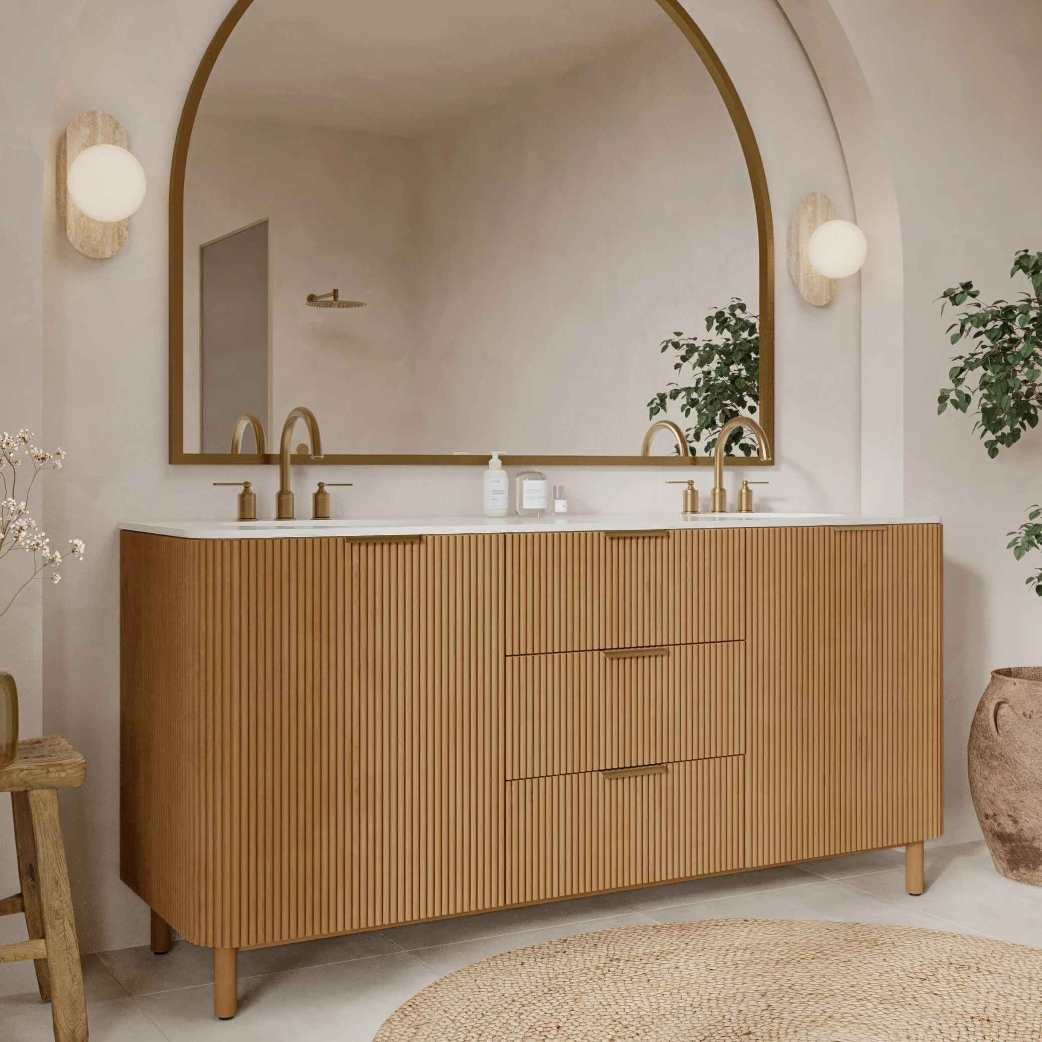 Command attention in your primary suite with the Havana 72" Double Vanity, a premier centerpiece that combines expansive luxury with modern organic texture. This grand freestanding unit is masterfully crafted from solid reeded birch in a Golden Honey finish, offering furniture-grade durability and a warm, radiant glow. The vanity features a massive, stain-resistant White Quartz countertop and dual undermount sinks, providing the ultimate symmetrical workspace for shared routines. To ensure a peaceful environment, the cabinetry includes spacious soft-close drawers and doors that offer silent, high-capacity storage for all your essentials. Experience the perfect fusion of large-scale sophistication and low-maintenance performance with this flagship statement piece.