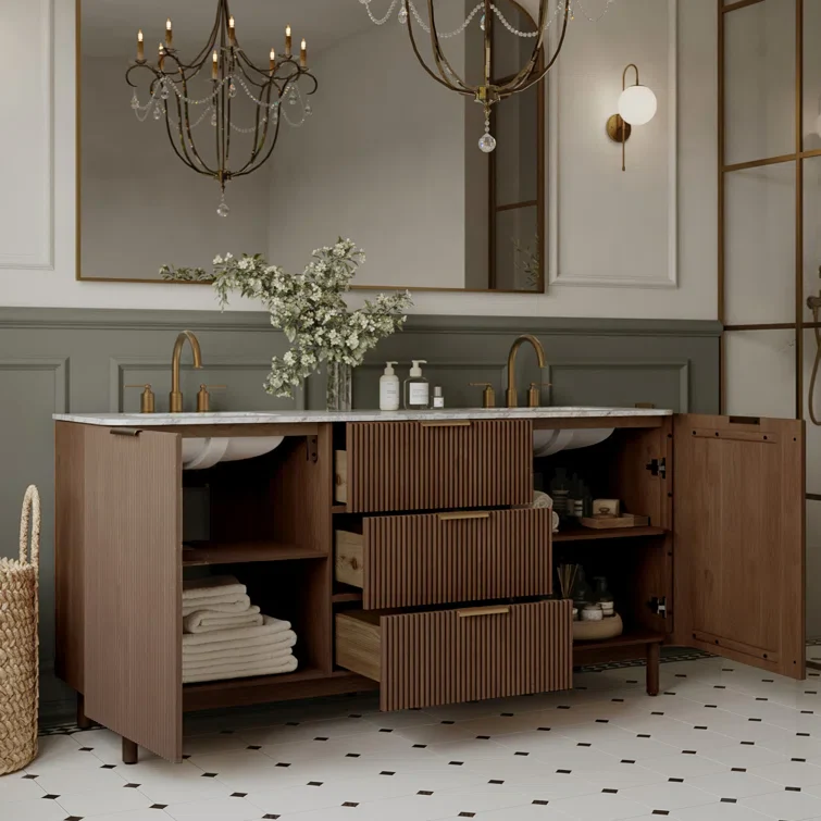 Transform your primary bathroom into a luxury retreat with the Havana 72" Double Vanity, a grand centerpiece that exudes classic warmth and modern texture. This expansive freestanding unit is masterfully crafted from solid reeded birch in a rich brown finish, ensuring furniture-grade durability and a sophisticated, tactile aesthetic. The vanity is crowned with a premium Carrara marble countertop and dual undermount ceramic sinks, providing a vast, symmetrical workspace for a seamless shared routine. For effortless organization, the layout features high-capacity soft-close drawers and doors that provide silent storage for all your wellness essentials. Invest in an unparalleled blend of traditional craftsmanship and timeless stone to anchor your large-scale renovation.