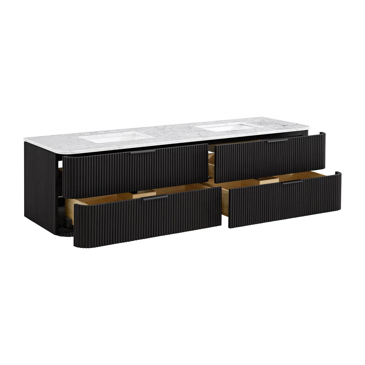 Redefine modern luxury in your primary suite with the Havana 72" Floating Vanity, a grand-scale centerpiece that offers a bold, architectural statement. This wall-mounted design is masterfully crafted from solid reeded birch in a dramatic black finish, creating a sleek, airy aesthetic while maximizing floor space. The vanity is paired with a premium Carrara marble countertop and dual undermount ceramic sinks, providing a vast and symmetrical workspace for a seamless shared routine. Optimized for organization, the expansive cabinetry features integrated soft-close drawers that offer silent, high-capacity storage for all your wellness essentials. Experience the perfect marriage of sophisticated, moody elegance and space-saving furniture-grade construction.