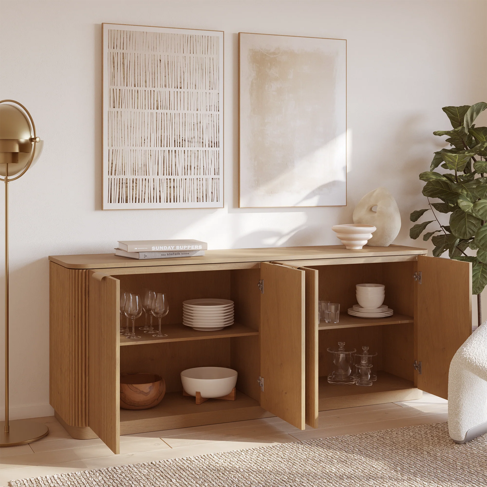 Redefine your home’s aesthetic with the Havana 74" Sideboard, a premier storage centerpiece that brings sophisticated dimension and luxury to any dining or living space. Expertly crafted from a blend of solid and engineered wood on a sturdy plinth base, it features a warm, natural birch finish that enhances your decor with organic texture. The reeded exterior is accented by elegant gold-finished hardware, offering a high-end look while four soft-close doors reveal adjustable shelving for seamless organization of linens and dinnerware. Designed for versatility and security, the spacious top surface serves as a perfect coffee station or display area, complete with an included wall anchor for added stability. Experience the perfect harmony of furniture-grade craftsmanship and contemporary, functional design.