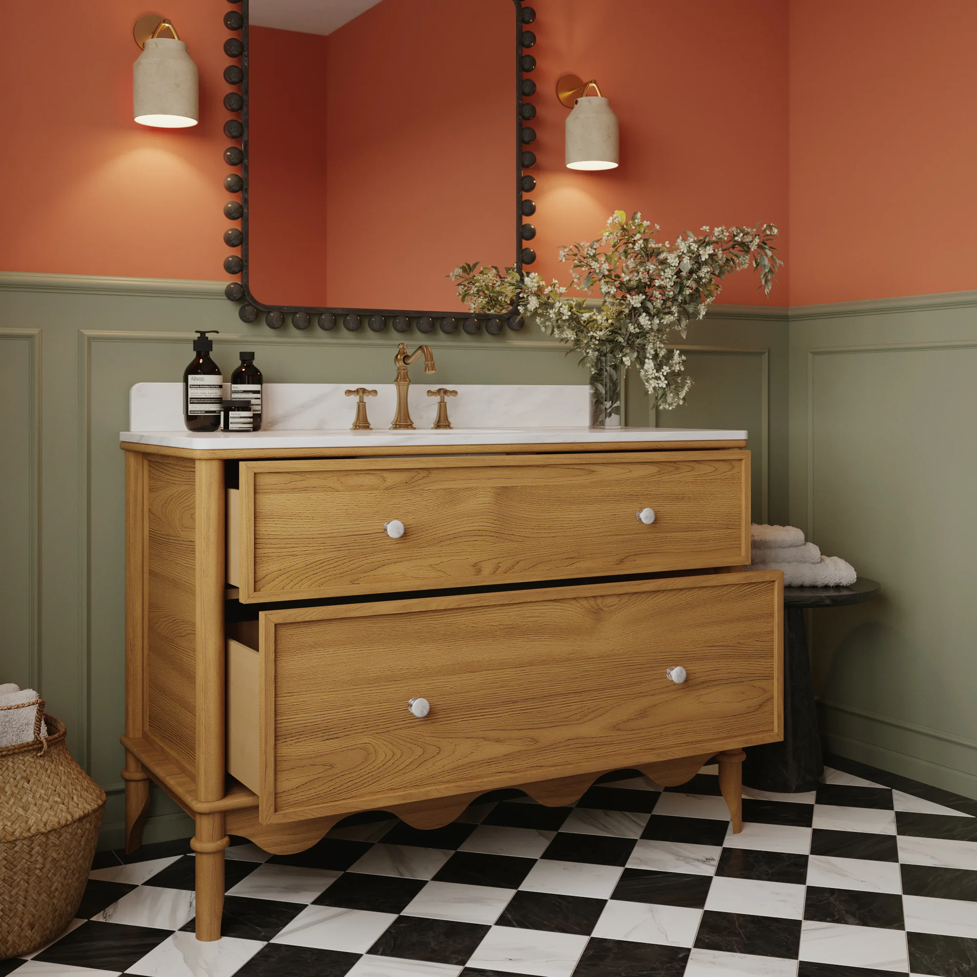 The Juliette 48"W x 22"D single-sink bathroom vanity in your choice of Enhanced Natural Oak or Blanc White is where vintage charm meets classic bohemian sensibilities. This stunning vanity brings the warmth and simplicity of natural wood into your home with its beautifully textured finish. The scalloped base and gracefully turned legs give it a unique, handcrafted feel that adds character to any master or family bathroom. This elegant piece is designed to be the centerpiece of your space. It features multiple deep soft-close drawers for organized storage and an integrated undermount sink with a durable cultured marble top.
