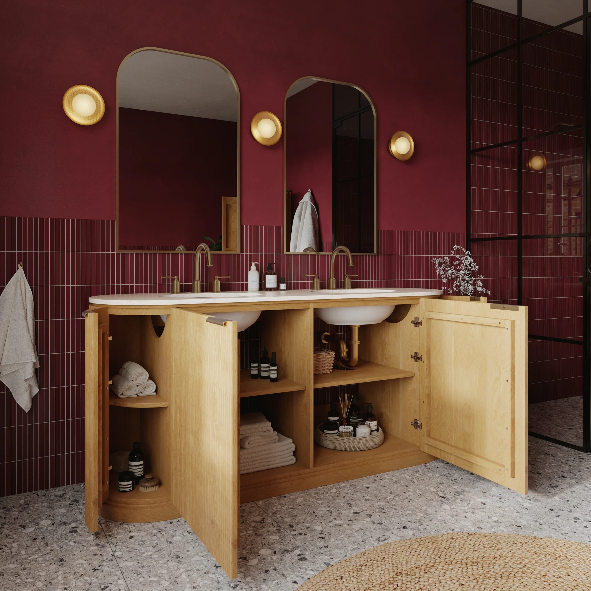 Elevate your primary bathroom into a sanctuary with this stunning double vanity, a masterclass in high-end style. Defined by its contemporary pill-shaped profile and sophisticated reeded texture, the warm birch finish brings an organic touch to its clean silhouette, creating a serene focal point. Tailor this designer piece to your vision by choosing between a flawless countertop for a crisp, modern aesthetic, or an intricate Travertine-Inspired Quartz for warm, earthy elegance. The durable, non-porous quartz surface is complemented by two deep, undermount oval sinks perfect for a shared master suite. Behind four soft-close doors, a spacious interior with adjustable shelves offers ample, customized storage for a clutter-free environment. Ideal for your master bathroom renovation, this fully assembled wood vanity with a quartz top serves as the ultimate statement piece, combining luxury design with everyday practicality. Bring home this centerpiece of modern bathroom furniture today and transform your space into a spa-like retreat.Elevate your primary bathroom into a sanctuary with this stunning double vanity, a masterclass in high-end style. Defined by its contemporary pill-shaped profile and sophisticated reeded texture, the warm birch finish brings an organic touch to its clean silhouette, creating a serene focal point. Tailor this designer piece to your vision by choosing between a flawless countertop for a crisp, modern aesthetic, or an intricate Calacatta-Inspired Quartz for warm, earthy elegance. The durable, non-porous quartz surface is complemented by two deep, undermount oval sinks perfect for a shared master suite. Behind four soft-close doors, a spacious interior with adjustable shelves offers ample, customized storage for a clutter-free environment. Ideal for your master bathroom renovation, this fully assembled wood vanity with a quartz top serves as the ultimate statement piece, combining luxury design with everyday practicality. Bring home this centerpiece of modern bathroom furniture today and transform your space into a spa-like retreat.