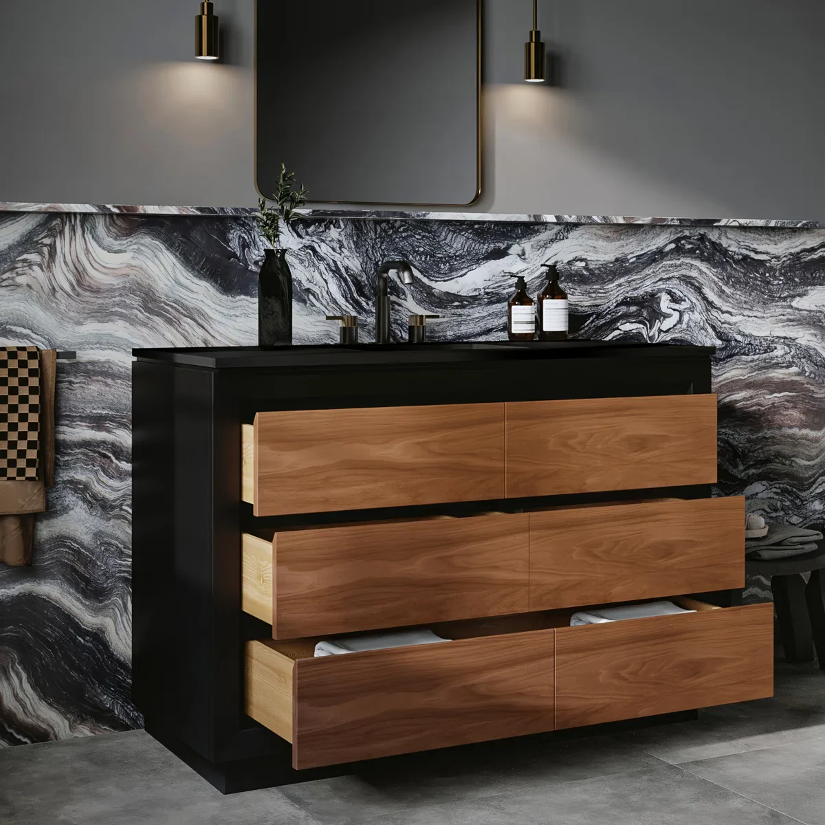 Introducing our sleek and modern 48-inch bathroom vanity, perfect for elevating your bathroom decor to the next level. Featuring three large soft-close under-mount drawers, your bathroom essentials are always within reach. The black and walnut contrast finish adds a beautiful modern touch to any bathroom