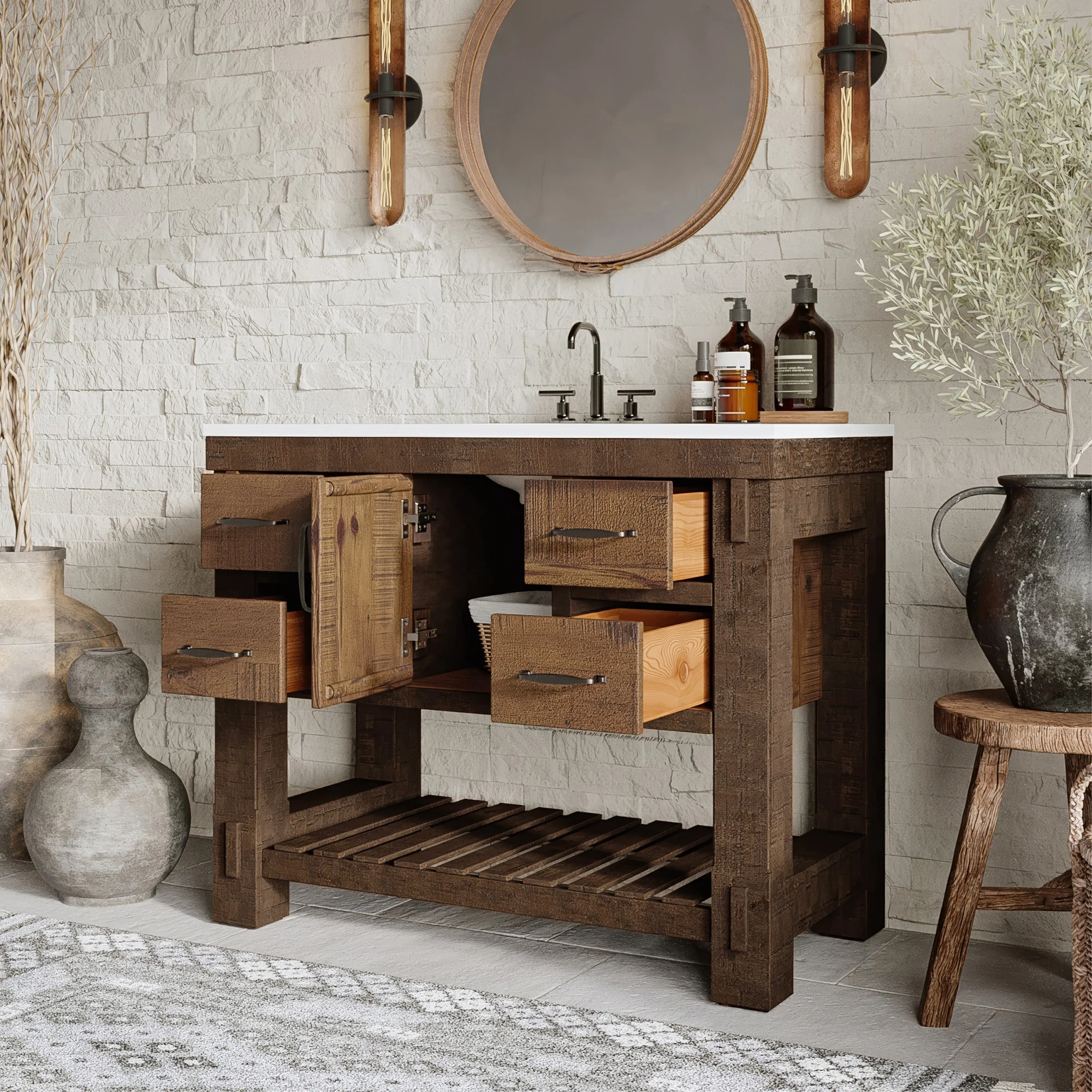 Transform your bathroom with the Bromley farmhouse vanity, featuring a hand-distressed solid pine frame with a rich brown, subtle two-tone wood finish and a pristine white quartz countertop with matte finish. This premium bathroom vanity combines rustic charm with modern conveniences, built with time-honored materials, construction, and quality. Ample storage is provided by soft-close, under-mount drawers crafted with dovetail joinery, plus open bottom storage perfect for displaying luxury linens and decorative baskets. The hand-finished details and authentic farmhouse styling bring timeless charm to any bathroom while offering the durability and functionality of contemporary design. Experience farmhouse charm with modern conveniences in this expertly crafted vanity that will last for years to come.
