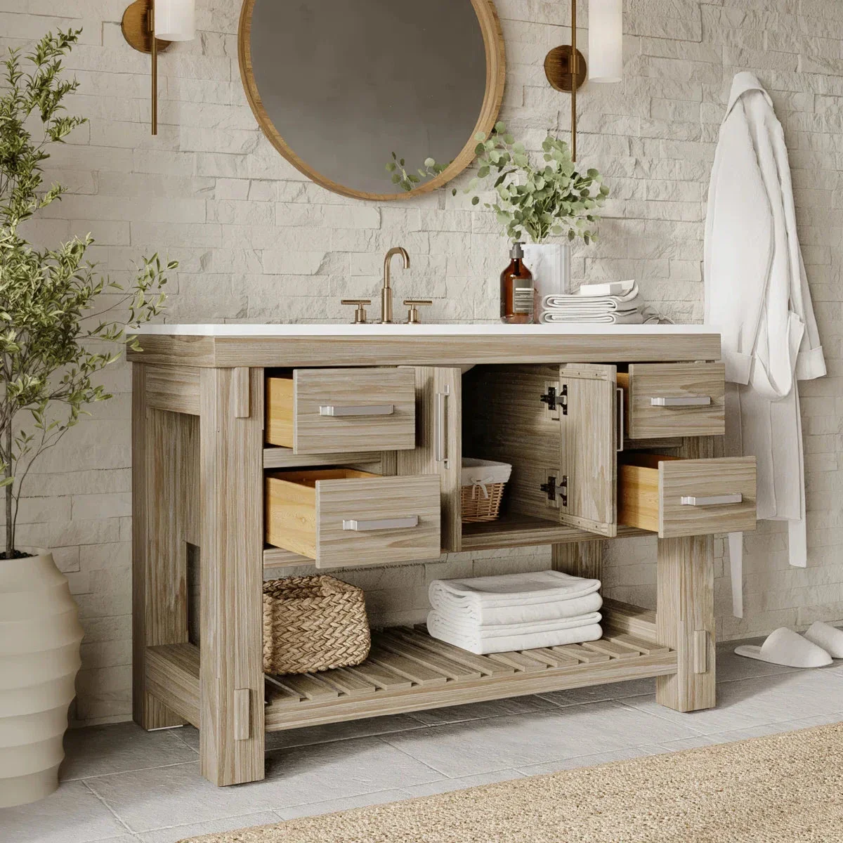 Transform your bathroom with the Bromley farmhouse vanity in a washed pine finish, featuring a hand-distressed solid wood frame and a pristine white quartz countertop. This premium bathroom vanity combines rustic charm with modern conveniences, built with time-honored materials, construction, and quality. Ample storage is provided by soft-close, under-mount drawers crafted with dovetail joinery, plus open bottom storage perfect for displaying luxury linens and decorative baskets. The hand-finished details and authentic coastal styling bring timeless charm to any bathroom while offering the durability and functionality of contemporary design. Experience coastal charm with modern conveniences in this expertly crafted vanity that will last for years to come.